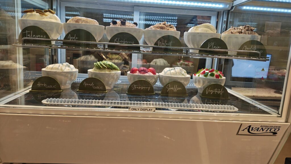 プレーン、スキャリオン(ネギ)、アボカドガーリック、チョコレートチップ、ベジタブル、ハラペーニョ、ロックス(スモークサーモン)