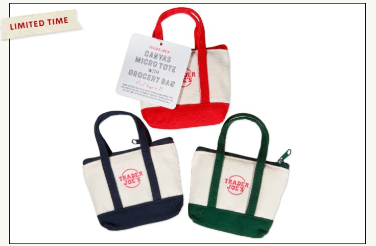 - 今年の10月にトレジョが発売していた「Mini Canvas Tote(ミニ・キャンバス・トート)」が大きな話題になっていましたが、それよりも小さい“マイクロ”化というが話題性を持っている。(過去にも同じマイクロ・キャンバス・トートがありましたが、その時は赤と黒の2色のみでした)