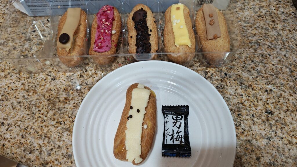 それぞれのエクレアには、そのフレーバーに合わせたトッピングやチョコが載っていて、見た目にも違いがあって楽しいです。